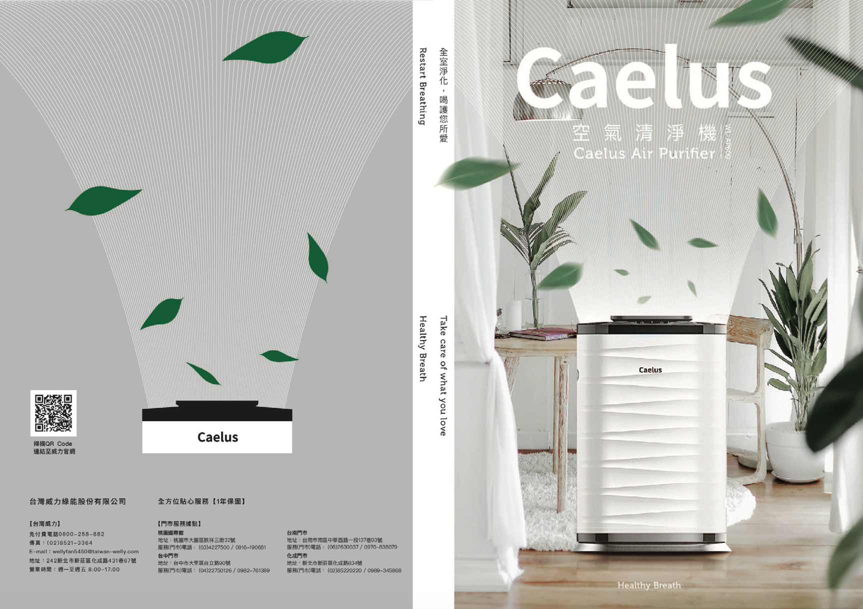 以白底帶來空氣潔淨、視覺淸爽的感受, 封面空氣淸淨機的 底圖作為Caelus品牌的C和優良空氣循環形成的㘣、宛若置 身植物林的淸新感, 圓滿、完美的由空氣淸淨機傳遞出去。 封面可作局光或燙珍珠箔的效果, 增添視覺變化、 提高消費者注意力。