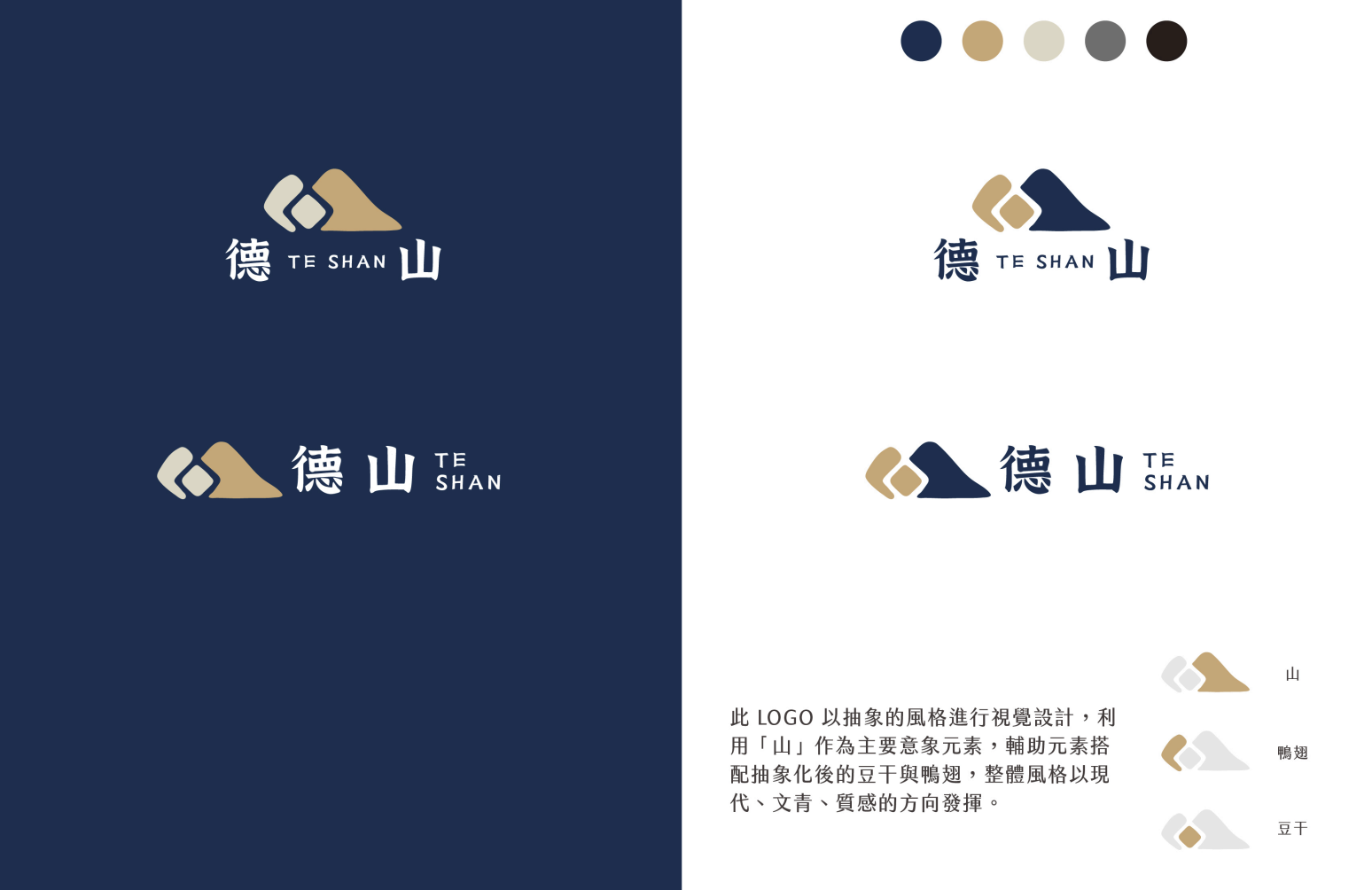 設計風格:八角形的太陽具有獨特的幾何美感,與山和鴨翅形成了對比,同時又和諧地結合在一起,強調了品牌形象的完整性和多元性。