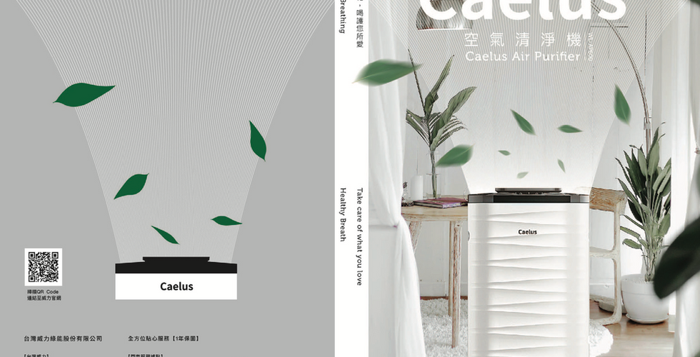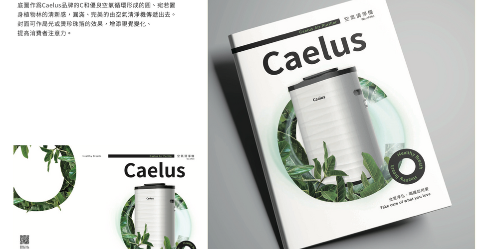 以白底帶來空氣潔淨、視覺淸爽的感受, 封面空氣淸淨機的 底圖作為Caelus品牌的C和優良空氣循環形成的㘣、宛若置 身植物林的淸新感, 圓滿、完美的由空氣淸淨機傳遞出去。 封面可作局光或燙珍珠箔的效果, 增添視覺變化、 提高消費者注意力。