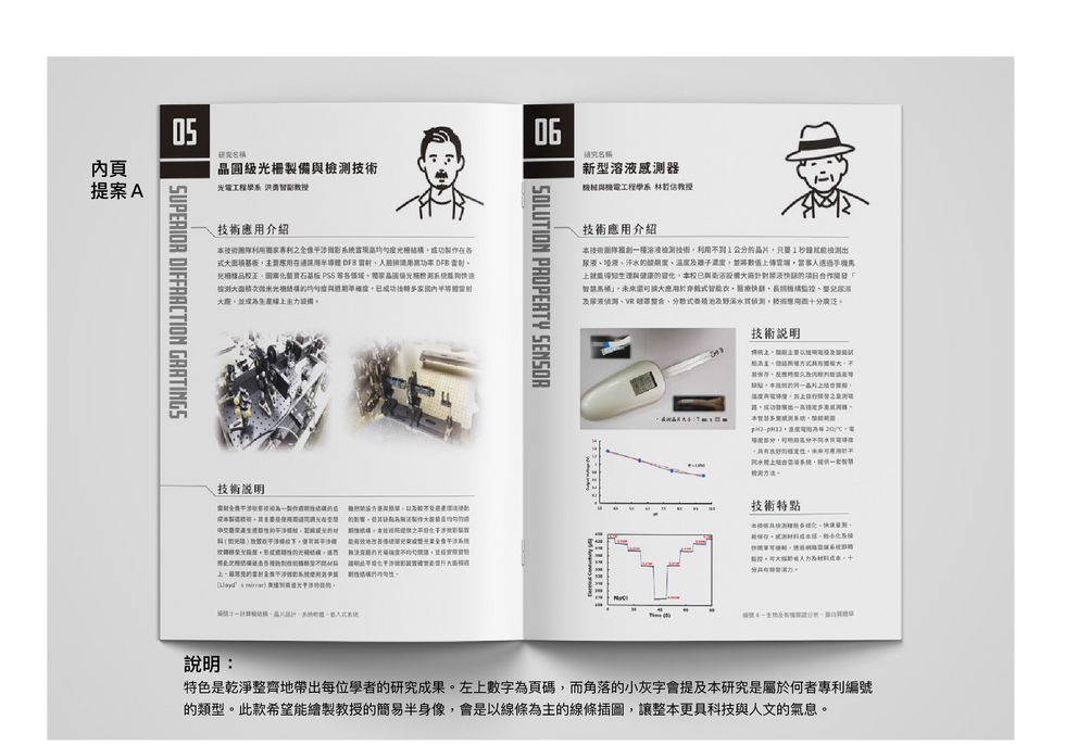 約瑟夫此次提案3款型錄封面設計,在設計細節上都在傳達「產學合作」和「科技結合人文」的巧思,且為了避免專業領域太生硬,我們也在內頁各教授的研發成果中加入教授的似顏繪,拉近與目標受眾的距離。